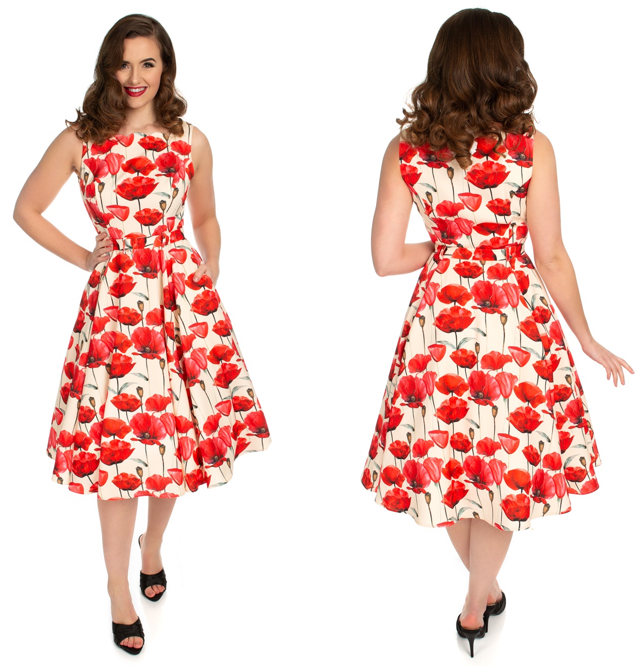 Das Sweet Poppy hat einen weichen fließenden Stoff, große Mohnblumen leuchten auf einem cremefarbenen Untergrund. Das Oberteil liegt eng an und hat einen verspielten bogenförmigen Ausschnitt. Der Tellerrock ist weit schwingend, ideal um es mit einem Petticoat zu tragen. Mit dem gleichfarbigen Gürtel kannst du deine Taille perfekt in Szene setzen.